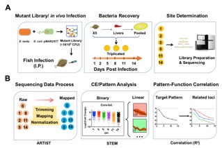 2017年10月3日,美国微生物学会权威期刊mBio(2017,8(5): e01581-17)在线发表我校的研究成果。科研人员利用转座元件构建突变株文库,使用突变株文库对大菱鲆进行腹腔感染,在感染的不同阶段进行回收突变株,利用高通量测序进行对文库中突变株的丰度变化进行检测。实验结果显示已知的三型和六型分泌系统在感染初期并非必需基因,而到感染后期成为条件必需基因。本研究的创新点在于对Tn-seq技术进行改进,开发出了多时间点的聚类分析方法(PACE, Pattern Analysis of Conditional Essentiality)。使用该方法,可以对突变株在多个时间点的动态变化过程进行分类,并在全基因组范围内评价每个编码基因(位点)对于该菌在体内感染过程的贡献。同时,利用已知减毒活疫苗靶点基因的动态模型,寻找到了新的优良候选疫苗靶点基因,为疫苗理性设计提供了新的思路。