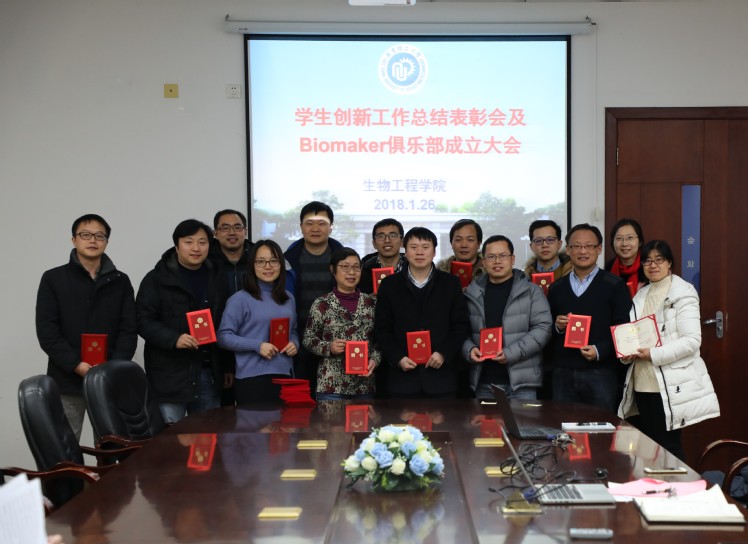 生物工程学院于2018年1月26日下午在奉贤大学生活动中心401室召开“学生创新工作总结表彰会”及Biomaker创新俱乐部成立大会。会议由学工委主任吴蓉主持。学院教学副院长王启要教授,大创负责人叶蕊芳教授,以及创新工作指导教师,创新活动相关学生参加会议。