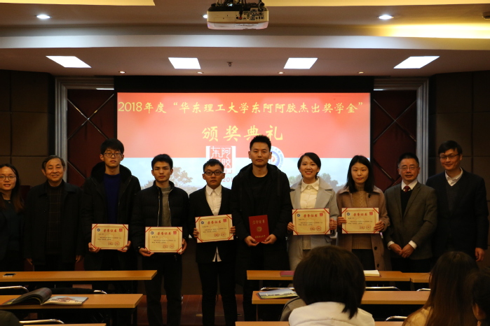 获奖学生代表博士生陈守文发言,表达了对东阿阿胶、华理的感谢,介绍了自己的科研经验,深刻的谈论了对“勤奋”的理解,激励同学们勤于思考,回报社会。