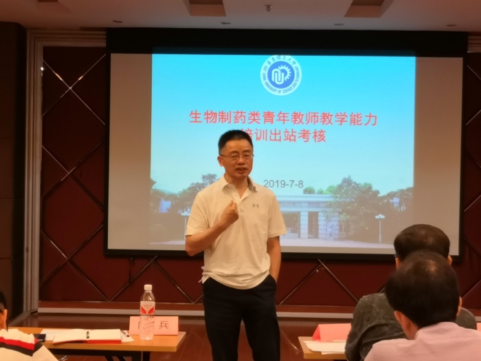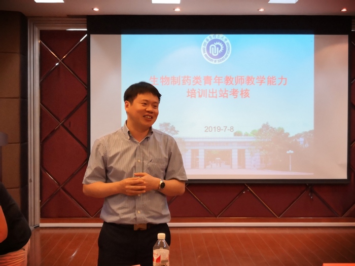 7月8日下午,生物制药类青年教师教学能力培训基地(以下简称“基地”)在实验十八楼315室举行了2019年度在站青年教师的出站考核,邀请了学院党委书记陆兵、基地药学院负责人高峰、学院本科教学督导组专家赵健、韩伟、周家春担任考核评委,基地的七位青年教师申请参加了本次出站试讲。