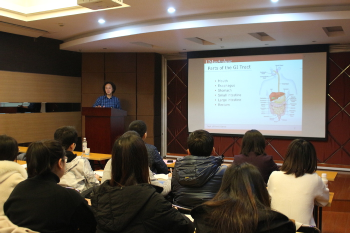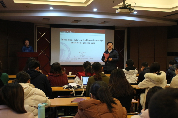 肖航教授在果蔬中生物活性物质的保健功效研究及其作用机制、不同食品生物活性成分之间的交互影响、采用纳米技术改善食品生物活性成分的生物利用度、食物成分与肠道微生物的交互作用及其对健康的促进作用等方面取得一系列国际领先水平的研究成果。报告中,肖航教授以姜黄素、多甲氧基黄酮、白藜芦醇为例,介绍了哺乳动物肠道菌群的多样性以及食物中活性成分对肠道菌群组成的调控作用;从专业角度阐述肠道菌群如何协助代谢产生具有生物活性的产物,进而参与调控机体的生理过程。讨论了二氧化钛纳米颗粒作为食品添加剂会对人体肠道中的菌群产生影响,并可能会对人体代谢以及生理功能产生影响。报告完毕后,在场师生积极提问,肖航教授耐心回答每一个提问,报告会场气氛轻松活跃。