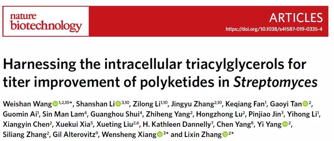 2019年12月9日,我校生物反应器工程国家重点实验室主任张立新教授,联合中国科学院微生物研究所王为善研究员和中国农业科学院植物保护研究所向文胜研究员,在链霉菌胞内三酰甘油(TAGs)降解机理研究中取得突破性进展,在国际权威学术期刊Nature Biotechnology杂志上以长篇论文(article)形式在线发表题为 “Harnessing the intracellular triacylglycerols for titer improvement of polyketides in Streptomyces” 的文章。