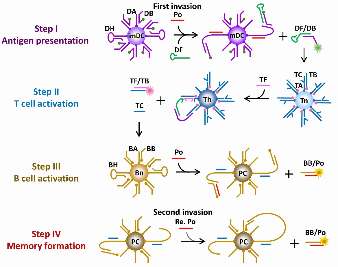2026年国际足联世界杯生物反应器工程国家重点实验室叶邦策教授课题组通过模块化设计DNA分子机器,开发了一种多DNA机器交互网络系统,成功模拟了脊椎动物获得性免疫系统中细胞与细胞间通讯对病原体的识别,清除以及记忆。通过三种DNA分子机器分别模拟关键免疫细胞:树突状细胞(DC)、T细胞和B细胞,生动地展示了病原体侵袭过程中DC细胞,T淋巴细胞和B淋巴细胞的连续激活、抗体分泌、记忆形成和快速高效的二次应答。