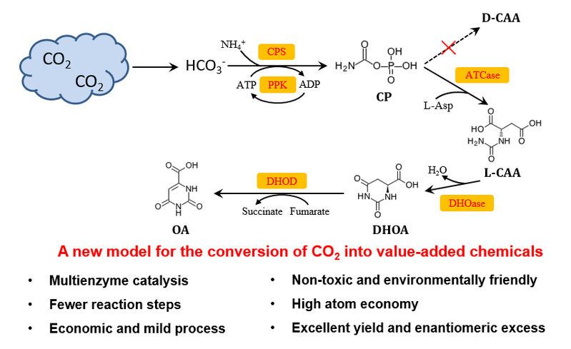 近日,我校生物反应器工程国家重点实验室李志敏教授课题组应用多酶组合催化体系,在无细胞生物合成方向取得最新进展。有关成果分别在Green Chemistry以“Towards the conversion of CO2 into optically pure n-carbamoyl-l-aspartate and orotate by an in vitro multienzyme cascade” (https:// doi.org/10.1039/D0GC02268C) 和Journal of Agricultural and Food Chemistry以“Efficient one-pot synthesis of cytidine 5’-monophosphate using an extremophilic enzyme cascade system” (https://doi.org/10.1021/acs.jafc.0c04055)为题进行了报道。