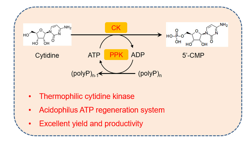 嘧啶代谢途径可以产生多种有重要功能的化合物,如乳清酸、胞苷酸、氨基酸衍生物等。课题组提出以CO2为底物进行体外多酶催化,两阶段一锅法合成氨甲酰天冬氨酸和乳清酸的新思路,通过嘧啶代谢-精氨酸循环途径转化CO2,生产高附加值产品。本研究首次利用体外酶催化碳酸氢铵高效合成氨甲酰磷酸,将原子经济性从60%提高到100%,新途径有望成为多种大宗化学品和生物活性物质的绿色、低成本生物制造平台。此外,课题组前期利用模块化策略和代谢工程实现了胞苷在重组大肠杆菌中的有效积累 (Yang et al. Biochem Eng J. 2020),后期采用基于多聚磷酸-多聚磷酸激酶的ATP再生系统,体外耦联胞苷激酶将胞苷转化成胞苷酸。通过大量酶的筛选获得具有优异性能的胞苷激酶 (TTN>1.3×107),成功构建了一个中度嗜酸的ATP再生系统 (TTN>4.0×106),优化反应条件后耦联体系在6小时内生产96 mM胞苷酸 (31.0 g/L),转化率达100%,该研究工作为胞苷酸大规模生产提供了一种新方法。