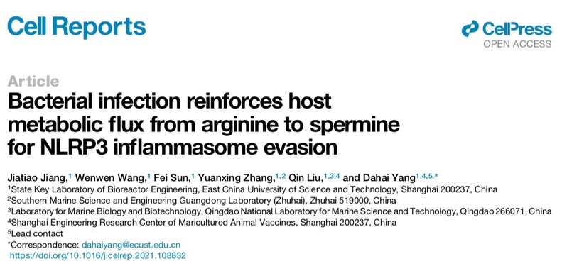 2021年3月9日,Cell子刊Cell Reports在线发表了我校刘琴教授课题组关于水产养殖关键病原细菌Edwardsiella piscicida与巨噬细胞互作的分子机制研究,阐明了细菌通过精氨酸代谢通路,靶向利用宿主细胞质多胺池,实现巨噬细胞NLRP3炎症小体逃逸的现象。