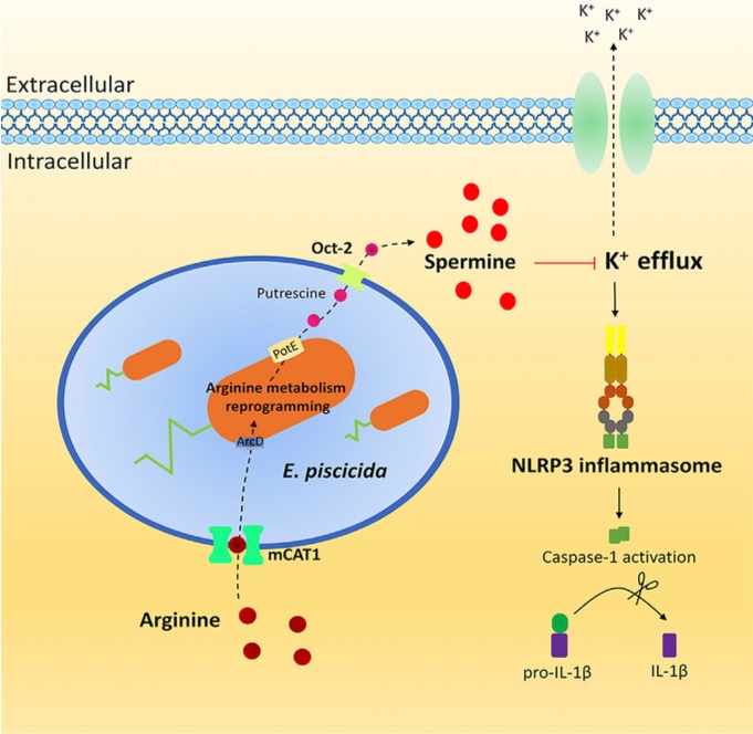 本研究通过E. piscicida转座子突变体文库感染NLRC4-/-巨噬细胞建立了细胞焦亡高通量筛选模型,发现细菌精氨酸代谢途径激活是抑制宿主NLRP3炎症小体的关键。在感染巨噬细胞过程中,E. piscicida激活自身的精氨酸代谢途径,招募宿主细胞的多胺转运系统,将细胞质内的精氨酸转化成精胺,导致宿主细胞质内精胺积累,靶向阻断钾离子外流,抑制NLRP3炎症小体的激活。进一步通过活体感染模型,证实了该菌可以通过自身精氨酸代谢途径来利用宿主体内合成的精氨酸,实现系统性感染。