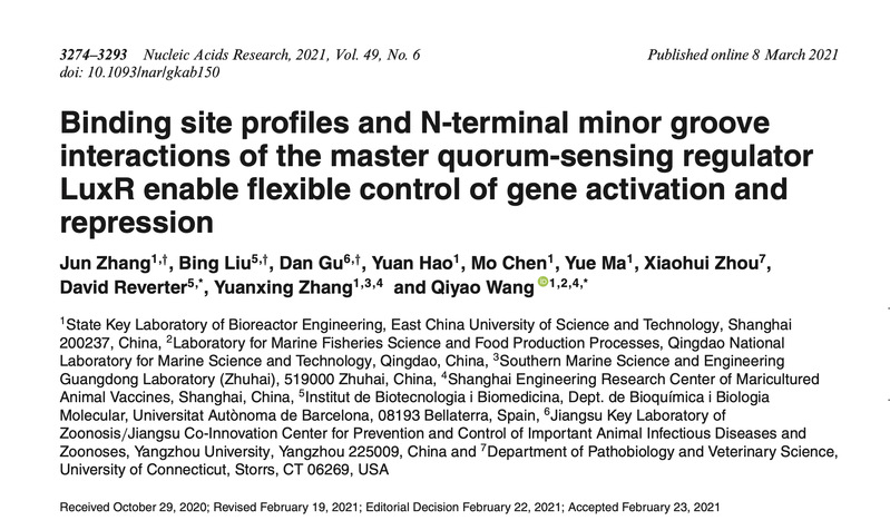 该研究通过多种高通量测序技术,系统鉴定了鱼类病原菌溶藻弧菌受LuxR调控的基因,发现LuxR蛋白识别并结合具有回文对称性和半回文对称性的DNA片段。受LuxR激活或抑制基因的启动子在结合位点的序列、数量及分布模式方面有显著不同特征。该研究首次解析了LuxR-DNA复合物结构,发现除了螺旋-转角-螺旋结构域介导的互作,LuxR的N-末端结构域与结合位点两端的小沟互作。该研究揭示了LuxR与激活型和抑制型DNA不同的结合机制,阐明了弧菌能实现交流通讯、产生群体行为的分子基础。该研究成果为设计QS抑制剂以及新型病害防控策略的研究打下良好基础。