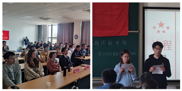 随后,食工191贾正阳、食质191陶雨晨、食质191夏菁晨、食工191金添四位同学进行了“建党英雄史,我读新中国”主题演讲,他们声情并茂讲述建党英雄故事,抒发了牢记党史、铭记党恩的情怀。随后是轻松有趣的游戏环节,分为两个部分:“红歌唱响暖人心”红歌传唱活动与“穿越百年,历史重现”党史电影配音活动。通过趣味游戏,同学们放声歌唱红歌,对党史电影进行生动形象的配音,表达了对党和祖国的热爱。