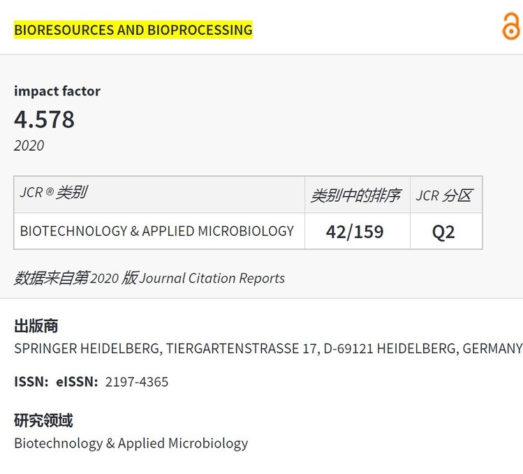 2021年6月30日,科睿唯安公司公布了2020年SCI收录期刊的最新影响因子,其中我校自主创办的英文期刊《Bioresources and Bioprocessing》(《生物资源与生物加工》,简称“BIOB”)经过近八年精心培育,正式获得了首个影响因子4.578,在生物技术与应用微生物学领域位居JCR Q2区前列,明年有望进入JCR Q1区。这标志着我校自主创办的本土学刊获得了国际学术界和出版界的认可,从此迈上世界一流期刊征程。