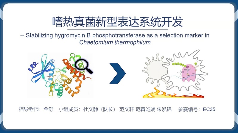 在科学探究类赛道中,由全舒老师指导的项目“嗜热真菌新型表达系统开发”(成员:杜文静、范文轩、范黄昀娴、朱泓锦)在上海市赛环节进入公开答辩(仅3支队伍入围),获得上海市特等奖、全国一等奖。