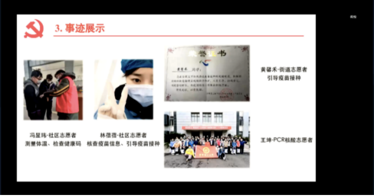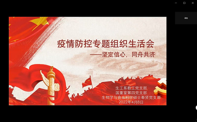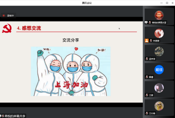 在这个特殊时期,生工系教工党支部、国重室研究生第四党支部、生物学与食品科学硕士奉贤党支部,联合举办了这次别开生面的组织生活会,这一形式打破了师生间的严肃氛围,更多的是作为党员同志的开诚布公、畅所欲言,也让三个党支部的各位党员更好地了解情况,剖析现状。会上严肃讨论上海市疫情现状和政策,身在家中或者两校区的同志交流生活近况,大家一致认为互帮互助、渡过难关,在这个艰难时刻十分重要。来自生工系教工党支部的曹学君分享自身心路历程,他强调,疫情防控不仅是一场身体的战役,更是一场心灵的博弈,提醒同志们要获取正确的信息,保持自身心理健康的同时也要发挥先锋作用,为身边的人带去力量。来自生物学与食品科学硕士奉贤党支部的叶晗说到,感谢学校、感谢全体教职工对全体在校师生日常生活饮食的照顾,让这段隔离管控的日子过得很安心,作为党员要充分深入到同学中去,关心照顾身边同学的情绪,也要敢于发出正确的声音,维护校园内这一来之不易的平稳安逸。
