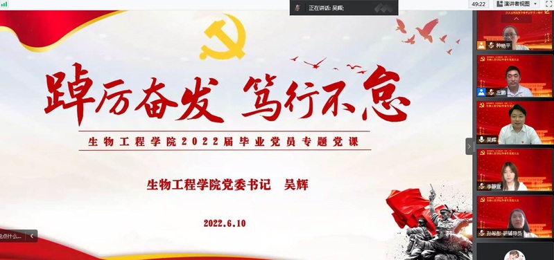 吴辉以“踔厉奋发、笃行不怠”为题,为2022届毕业生党员上最后一堂党课。他向毕业生党员提出四点要求。一是要不忘初心。共产党员一定要坚定理想信念,厚植家国情怀,永葆党员本色。二是要牢记使命。作为青年党员要练就过硬本领担当时代重任,为中国人民谋幸福、为中华民族谋复兴。三是要勇于担当。他以疫情期间涌现的优秀党员志愿者为例,鼓励同学们知责于心、担责于身、履责于行,在担当作为中传承华理基因,弘扬生工抗生素精神。四是要奋勇拼搏。不负韶华,高扬理想风帆!