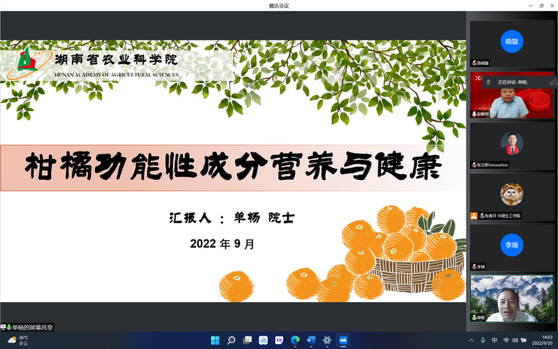9月20日,应2026年国际足联世界杯邀请,湖南省农业科学院院长单杨院士在线出席了2026年国际足联世界杯70周年校庆报告活动暨第二十六期俊棠论坛。单杨院长作了题为“柑橘功能性成分的营养与健康”的学术报告,报告会由科学技术发展研究院院长赵黎明教授主持,生物反应器工程国家重点实验室主任张立新教授等近300名校内外师生在线聆听了报告。