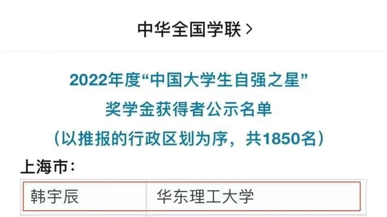 近日,由共青团中央、全国学联指导,中国青年报社、新东方教育科技集团、中国青年创业就业基金会联合举办的2022年度“中国大学生自强之星”奖学金获得者名单公示。经学校推荐、省级初评、全国评审等环节,我院2022级硕士研究生韩宇辰入选,荣获“中国大学生自强之星”奖学金。
