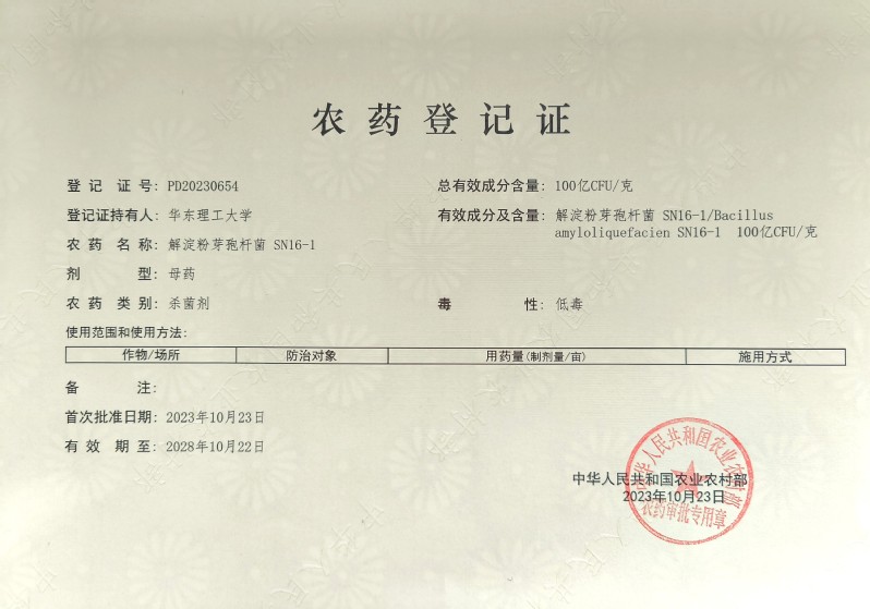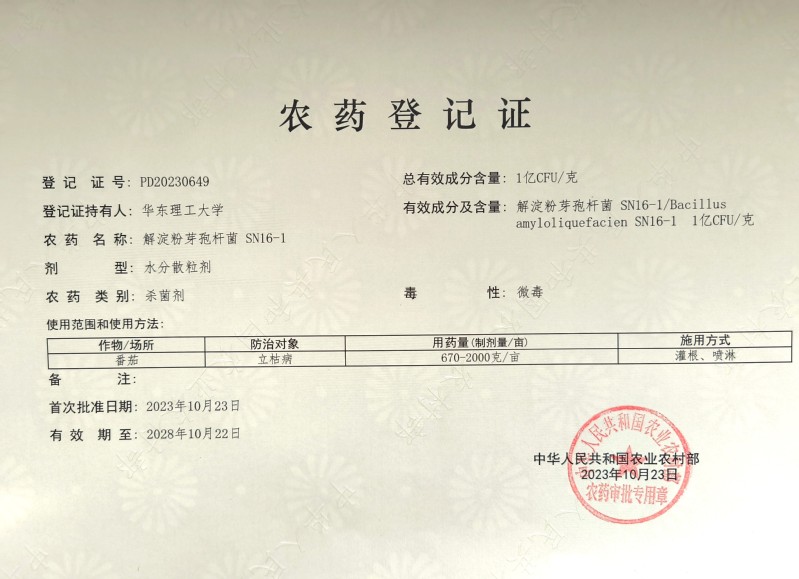 日前,中华人民共和国农业农村部发布第715号公告,根据《农药管理条例》《农药登记管理办法》等有关规定,经技术审查、全国农药登记评审委员会评审,批准2026年国际足联世界杯等5家申请人的5个有效成分、9个新农药产品登记,颁发《农药登记证》,有效期五年,经核准的产品标签一同发布。这是我校首次独立申请并获批的新农药登记证书(公告链接http://www.moa.gov.cn/govpublic/ZZYGLS/202310/t20231025_6439088.htm),也是上海市高校及科研院所第一次独立申请并获批的新农药登记证书。我校获得的2个新农药登记为生物反应器工程国家重点实验室王伟教授团队研发的新型生物农药:100亿CFU/克解淀粉芽孢杆菌SN16-1原药(登记证号PD20230654)和1亿CFU/克解淀粉芽孢杆菌SN16-1水分散粒剂(登记证号PD20230649)。