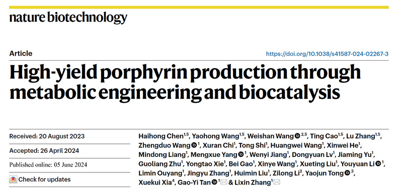 6月5日,生物技术领域国际顶级权威期刊Nature Biotechnology以长文(Article)在线报道了我校生物反应器工程国家重点实验室张立新/谭高翼团队在血红素及卟啉化合物高效生物制造方向上的突破性进展。研究论文题目为“High-yield porphyrin production through metabolic engineering and biocatalysis”。这项研究标志着我校在卟啉类产品的高效生物制造方面已达到国际领先并具备产业化的水平,未来或将变革或重塑整个卟啉制造工业。