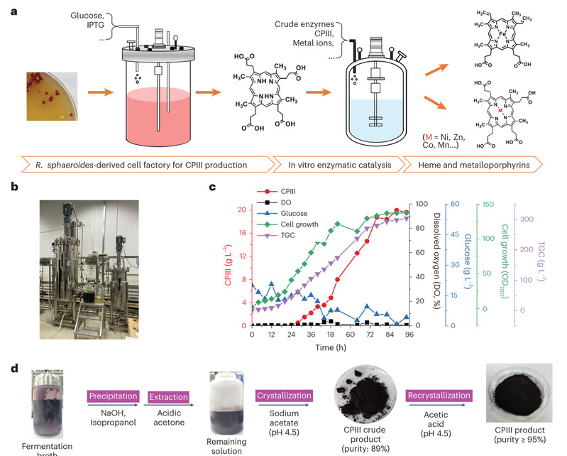 本研究创造性地利用光合细菌Rhodobacter sphaeroides作为底盘微生物,构建高效细胞工厂,并通过偶联酶催化生产卟啉化合物的策略。首先,基于CRISPRi的关键基因筛选和调控双组分系统prrAB磷酸化水平的方法,结合分批补料发酵,在5L反应器中使目标卟啉中间体CPIII的产量达到16.5 g/L;随后设计开发了基于CRISPR/Cas12a的高通量酶筛选平台获得高效的酶催化元件,实现了CPIII的高效酶促转化,合成了各种金属卟啉,包括具有抗肿瘤活性的Zn-CPIII和具有多种功能和用途的血红素。本研究还进一步在200L反应器中实现CPIII的中试放大,并建立了基于重结晶的CPIII纯化工艺,产物纯度超过95%,回收率接近90%。在5L反应器中通过酶催化放大合成血红素和锌卟啉,产量分别达到10.8 g/L和21.3 g/L,均为迄今报道的最高生产水平。技术经济分析(Techno-economic Analysis)表明,大规模生产CPIII和血红素具有显著的成本和制造优势。这项研究提供了高效合成卟啉类产物的解决方案,为大规模生产血红素和其他具有重要工业和医学应用的有价值的卟啉提供了全新的路线,有望重塑卟啉制造工业。