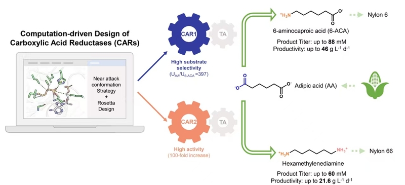 尼龙作为一类含有酰胺基团的高分子聚合物,全球市场超过300亿美元。随着汽车轻量化需求的兴起,全球尼龙需求快速扩增,其中尼龙6和尼龙66占到约90%。目前尼龙6和尼龙66的单体生产仍然依赖于以石油基底物为原料的化学工艺,而基于生物基原料的生物合成路线一直受限于羧酸还原酶的极低效率。