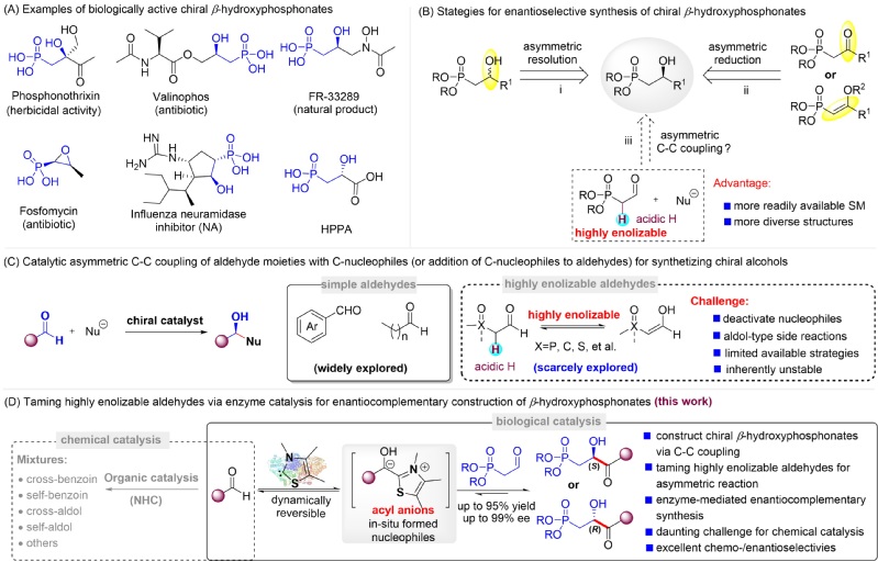 面对以上挑战,解永涛课题组通过重塑ThDP依赖酶功能,成功实现了高烯醇化醛的不对称加成反应用于合成β-手性羟基膦酸酯。该方法采用原位生成的动态可逆的acyl anion作为亲核试剂,避免了亲核试剂被酸性氢淬灭;利用酶活性空腔精准的底物识别及非共价键作用,可以实现产物高效、高选择性合成;同时,作者鉴定出了两个可以给出相反构型的酶,实现了产物立体互补合成,并详细阐明了立体互补机制。