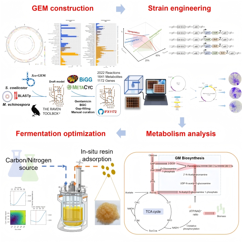 庆大霉素C1a是一种关键的广谱氨基糖苷类抗生素,不仅是庆大霉素复合物的主要活性成分,也是合成依替米星等重要抗生素的关键中间体。传统化学方法生产该药物面临诸多技术瓶颈。利用天然宿主棘孢小单孢菌作为微生物细胞工厂进行生物制造,被视为一条更具潜力的可持续路径。然而,该菌株代谢网络复杂,调控机制不明,限制了其生产效能的充分发挥。因此,开发系统性的工程策略以突破其生产瓶颈,具有重要的科学价值与应用前景。