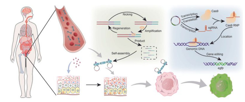 更具突破性的是,该DNA纳米平台创新性地集成了绿色荧光蛋白报告系统,能够在进行基因治疗的同时,对治疗效果进行实时、可视化的荧光诊断,首次在单一纳米体系中真正实现了“诊断-治疗”一体化功能。扫描电镜成像结果证实,所合成的单链DNA形态均匀、二级结构可控,为功能纳米平台的可靠构建提供了保障。