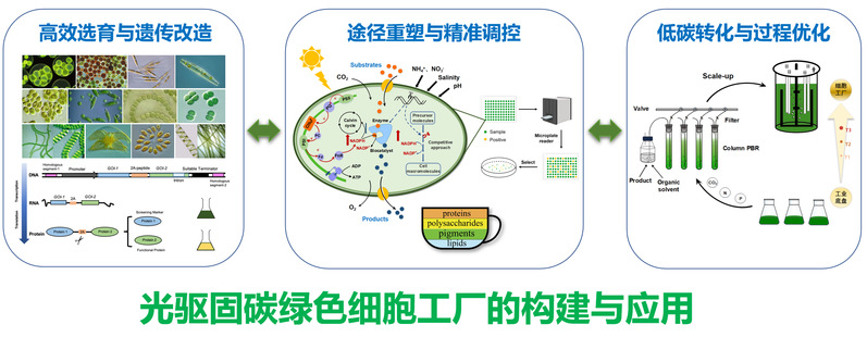 针对富含生物活性物质和高效环境修复的优良种质,整合光合微生物底盘与人工半导体材料,定向优化电子传递通道,突破自然光合作用的效率限制,赋予其新功能。重点探索人工光合杂化体的设计与改造、营养与环境因素对生长及代谢影响、光合自养和光暗发酵过程中碳氮磷高效生物转化及优化调控,为生物活性物质生产、环境治理(碳减排和废水处理)与生物质利用、生物饵料与饲料、生物能源的开发提供绿色低碳关键技术。